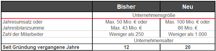Mit der Änderung der Norm wurden auch die Schwellenwerte der Unternehmen deutlich angehoben, um den Anwendungsbereich auszuweiten (§ 19a Abs. 3 EStG):