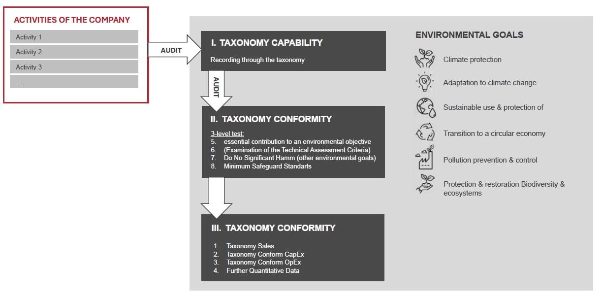 Under Article 8 of the EU-Taxonomy Regulation, companies within its scope must disclose how and to what extent their economic activities, which contribute to revenue, investments, and operating expenses, are environmentally sustainable. This involves assessing all activities for taxonomy eligibility and subsequently for taxonomy alignment based on the six environmental objectives defined by the EU-Taxonomy.