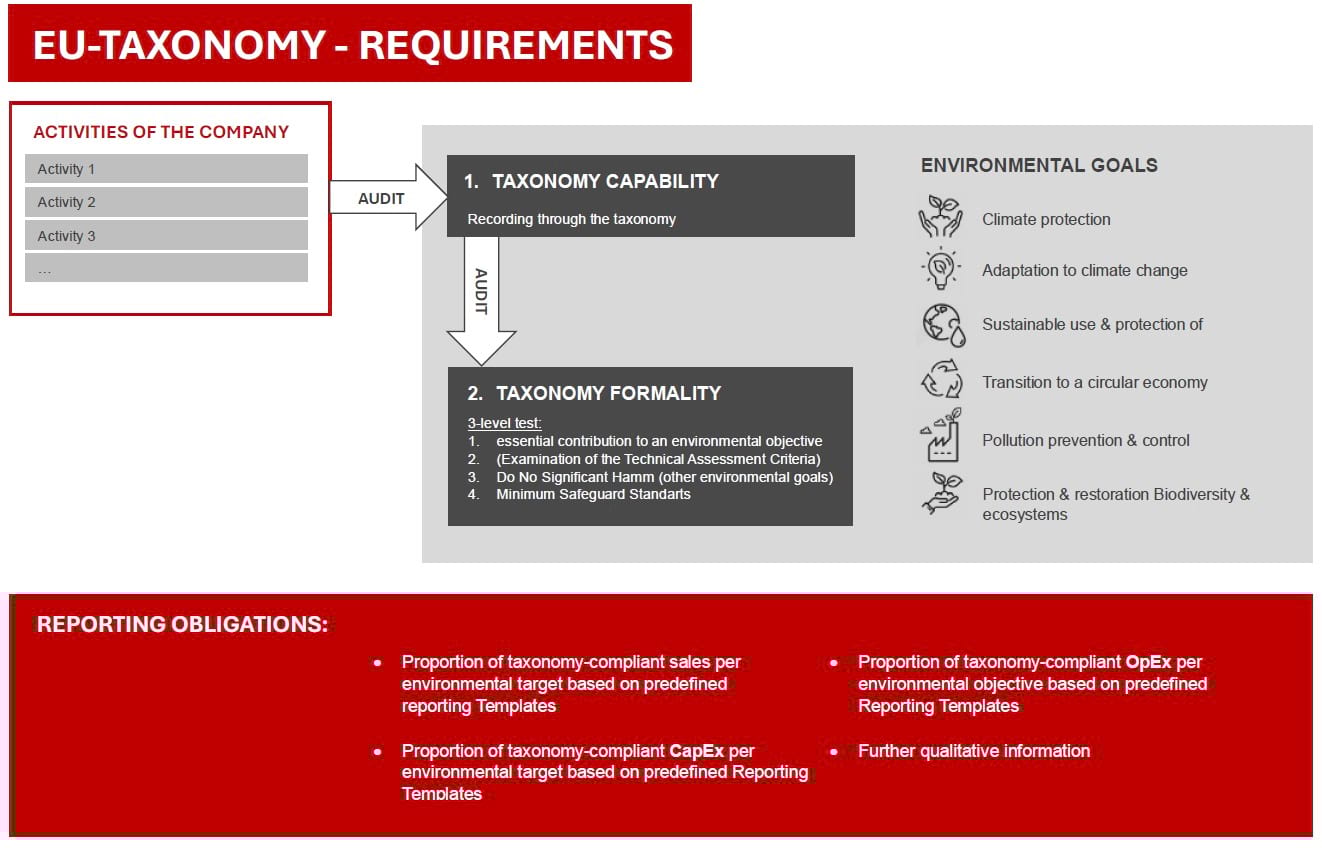 - Support in preparing mandatory reports regarding the EU-Taxonomy (non-financial reporting)