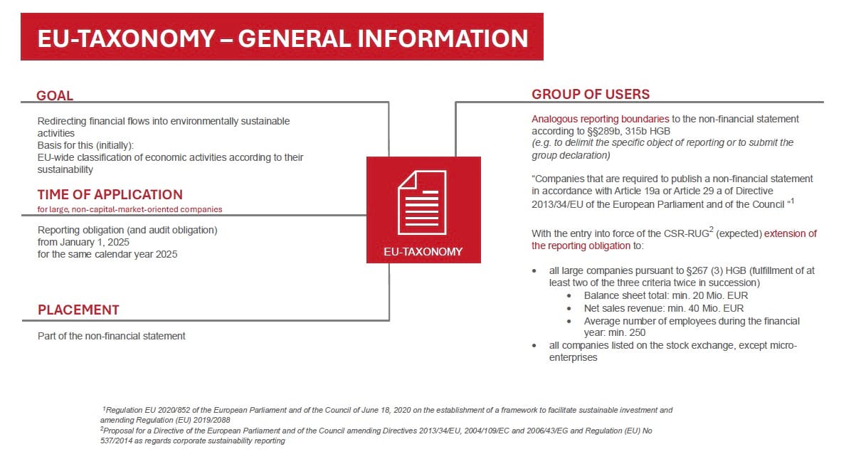 Starting in 2022, publicly listed companies subject to non-financial reporting must apply the EU-Taxonomy for fiscal year 2021. Reporting thresholds align with non-financial statements under §§289b, 315 HGB.
