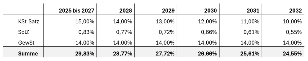 Dadurch ergeben sich beispielhaft bei einem unterstellten GewSt-Hebesatz von 400% in den Jahren 2025 bis 2032 folgende Steuerbelastungen (Summe aus GewSt, KSt/SolZ):